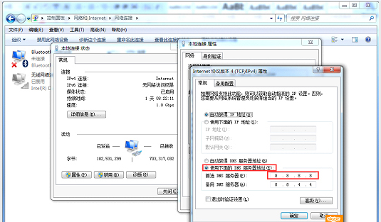 出现页面后选择使用下面的DNS 服务器地址--将首选DNS服务器地址改为8.8.8.8 备用DNS服务器地址改为8.8.4.4